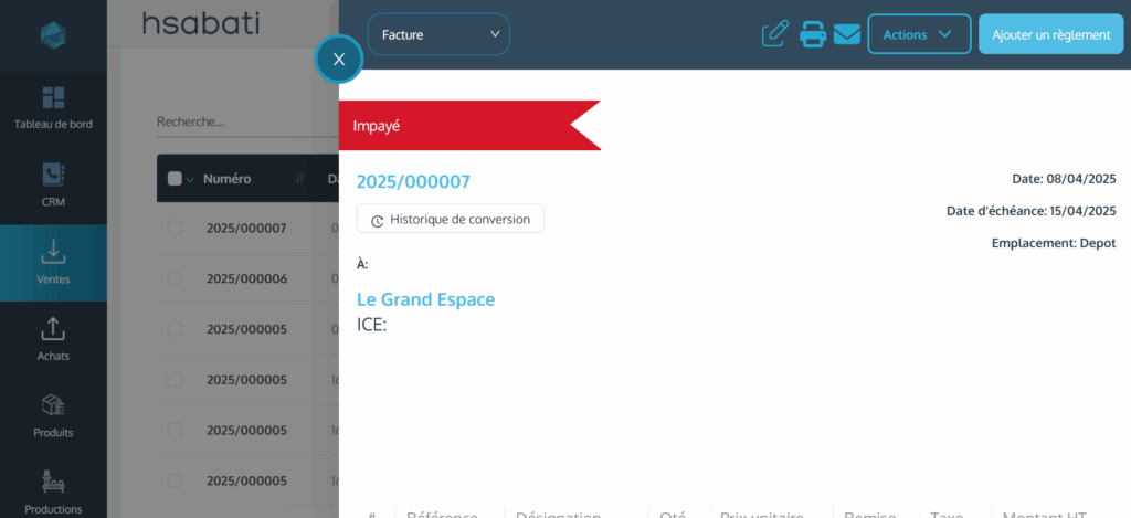 Cliquez sur le numéro de la facture à laquelle vous souhaitez ajouter un règlement.